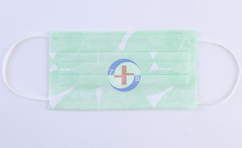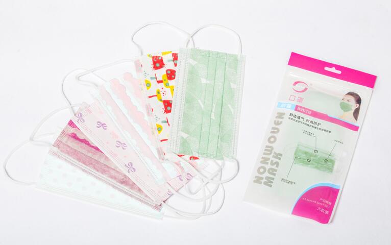 材料组成:优质无纺布+高效过滤布+印花图案水刺无纺布,可塑性鼻梁夹,氨伦耳带